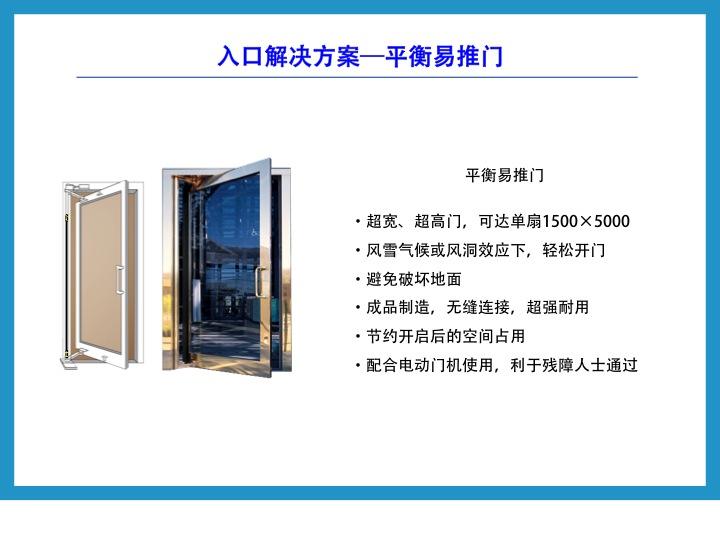 ○ 填补建筑大型外围门的行业空白,超越幕墙设计的风荷载要求。尤其是: 抗风压、抵抗恶劣气候、气密节能、耐超大流量使用、超轻开启力以及空间节省等方面逐樘门的定制,可以做到不同大小,相同开启力;